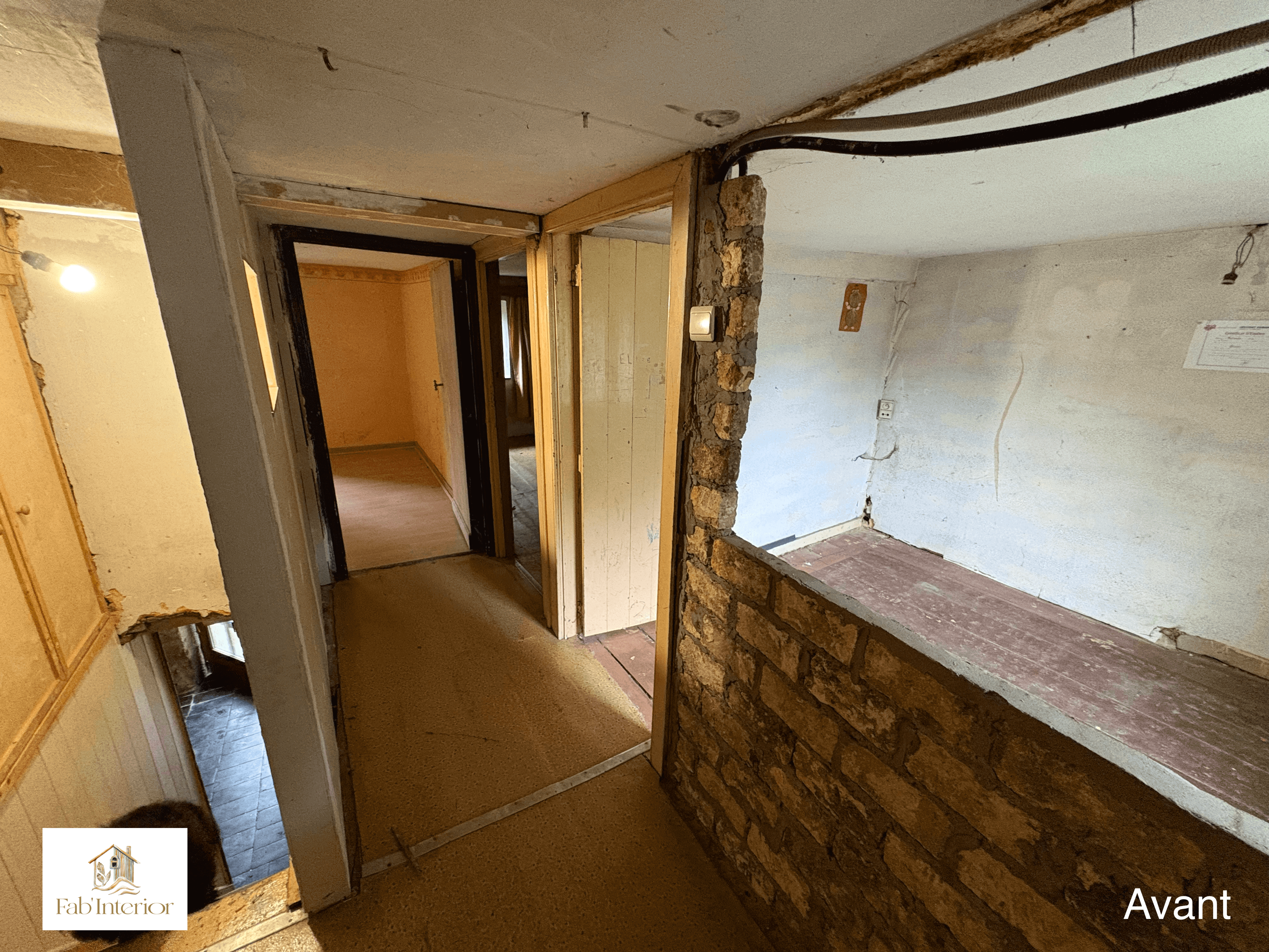 Les cloisons et doublages anciens ont été déposés pour corriger les désordres liés à l’humidité et aux matériaux vétustes. L’ensemble a été reconstruit sur des supports sains, en intégrant une isolation biosourcée performante et des matériaux naturels.